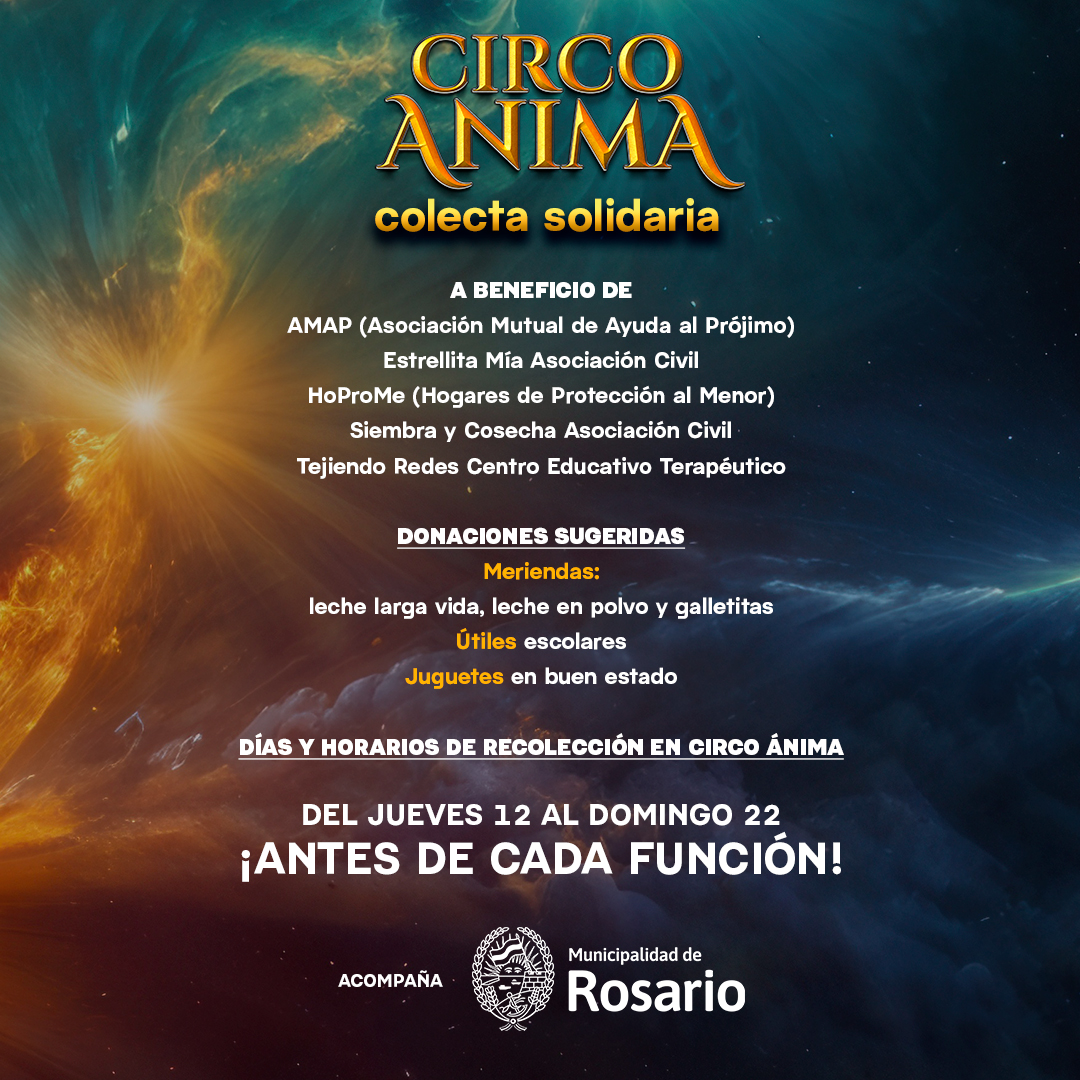 CIRCO ÁNIMA realizará una colecta en la carpa acompañado por la Municipalidad de Rosario a beneficio de cinco organizaciones que trabajan de manera cotidiana en el cuidado, la educación y la protección de las infancias. Las donaciones serán destinadas a AMAP Rosario (Asociación Mutual de Ayuda al Prójimo de Rosario), Estrellita Mía Asociación Civil, HoProMe (Hogares de Protección al Menor), Siembra y Cosecha Asociación Civil y Tejiendo Redes Centro Educativo Terapéutico.